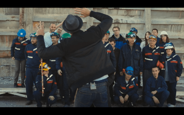 O operariado é tema de outra sequência na fábrica de Château-Arnoux-Saint-Aubin. A dupla se propõe a criar um mural com a imagem de trabalhadoras e trabalhadores da fábrica. Contudo, JR, como verdadeiro diretor de gestos, guia o movimento dos e das fotografadas para “a foto perfeita”. Mais uma vez as histórias, os gestos espontâneos e os rostos singularizados dão lugar ao processo artístico rígido e arranjado de foto-colagem. Para completar, a “imagem-produto” se presta a um desserviço para a luta operária, pois sugere muito mais uma relação alegre, resignada e conciliadora de trabalhadores com a fábrica empregadora.