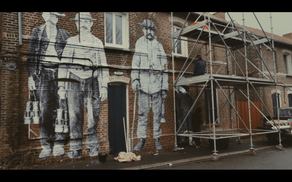 De certo, parece louvável a intenção de resgatar e dar corpo a essas figuras do passado – operários de físico calejado – assim como do presente – o rosto poderoso de uma resistente, inimiga dos sistemas de destruição. No entanto, a forma como a imagem é construída – aliada à trilha musical alegre e destoante – promove uma sensação ambígua: a de que vemos mais uma janela de exposição para o trabalho de JR, do que efetivamente uma exaltação das e dos sem-nome, das ordinárias e ordinários. O fotógrafo – e consequentemente o filme – parece acreditar mais no espaço de exposição do que propriamente na matéria exposta. Ao olhar para o rosto de Jeanine ampliado, vejo muito mais o trabalho de JR, vejo seu estilo, vejo sua opção pelas cores cinzentas usadas em uma infinidade de outros trabalhos, vejo sua estética-slogan gritando, mas vejo pouco de Jeanine. Vejo os tijolos, mas não vejo suas rugas.