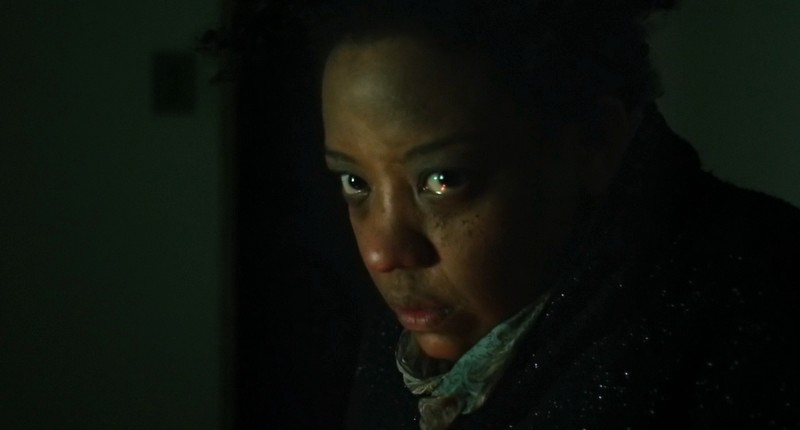 O ponto alto dessa dissonância acontece na cena mais íntima, quando vemos a personagem interagir com uma de suas bonecas falantes em seu quarto. Nesse momento, percebo que Dona Guiomar tem um pouco de Açucena todos os dias, não apenas quando a erê se manifesta. Seus gestos são muito táteis, praticamente convidando o filme a entrar na brincadeira. Só que a câmera se posiciona de forma afastada, registrando-a em segundo plano, em meio a duas de suas bonecas servindo como moldura. E mesmo quando a câmera se aproxima, é por breves instantes, somente para estabelecer um raccord que possibilita uma leitura ficcional. De toda maneira, há consistência e metodismo na sustentação de um estilo particular, fazendo com que meu interesse pelo trabalho de Isaac Donato apenas cresça.