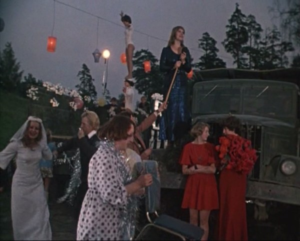Antes da chegada do outono, Liuba e Misha se despedem em uma noite na estrada. Liuba parte e deixa o motorista de caminhão solitário no plano. Na banda sonora, uma canção que fala da partida e da necessidade de se seguir. A montagem concatena uma elipse temporal que traz Liuba, com um penteado louro e encaracolado (diferente do que usava anteriormente), junto a outras moças que caminham no meio das peças produzidas por uma fábrica. A trupe está prestes a se lançar em uma nova empreitada, para conhecer ainda mais esse vasto mundo. Liuba, agora, está ao lado de outras mulheres e também de Nikolai, ao que parece ter sido sua escolha para companheiro. O comboio se ajeita em meio a camas, móveis e espelhos postos na beira da estrada. Crianças brincam sobre as camas e escutamos seus jogos de palavras no extracampo. Há todo um investimento sonoro e imagético no fora de campo que adentra a cena por meio dos reflexos dos espelhos.